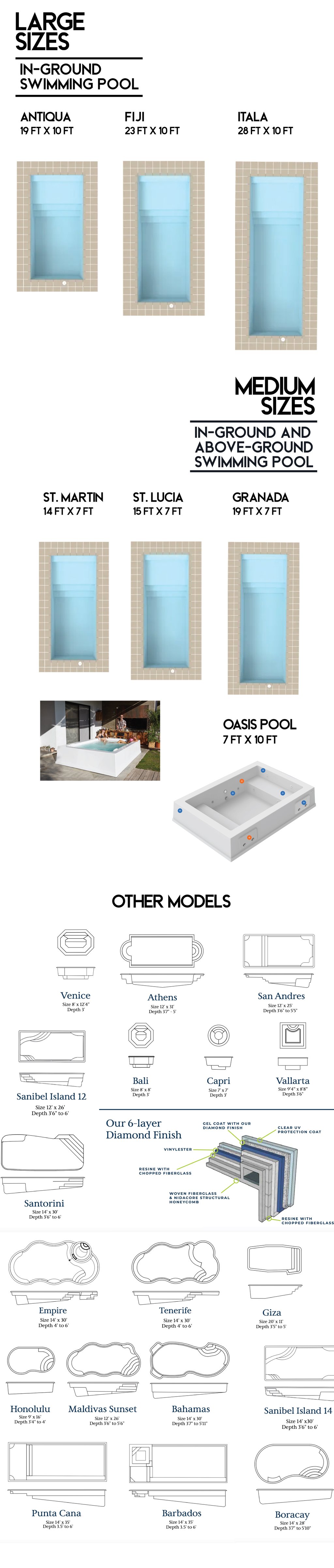 We offer fiberglass pool models in a variety of dimensions, from compact pools ideal for smaller patios to larger designs perfect for family enjoyment and entertaining.